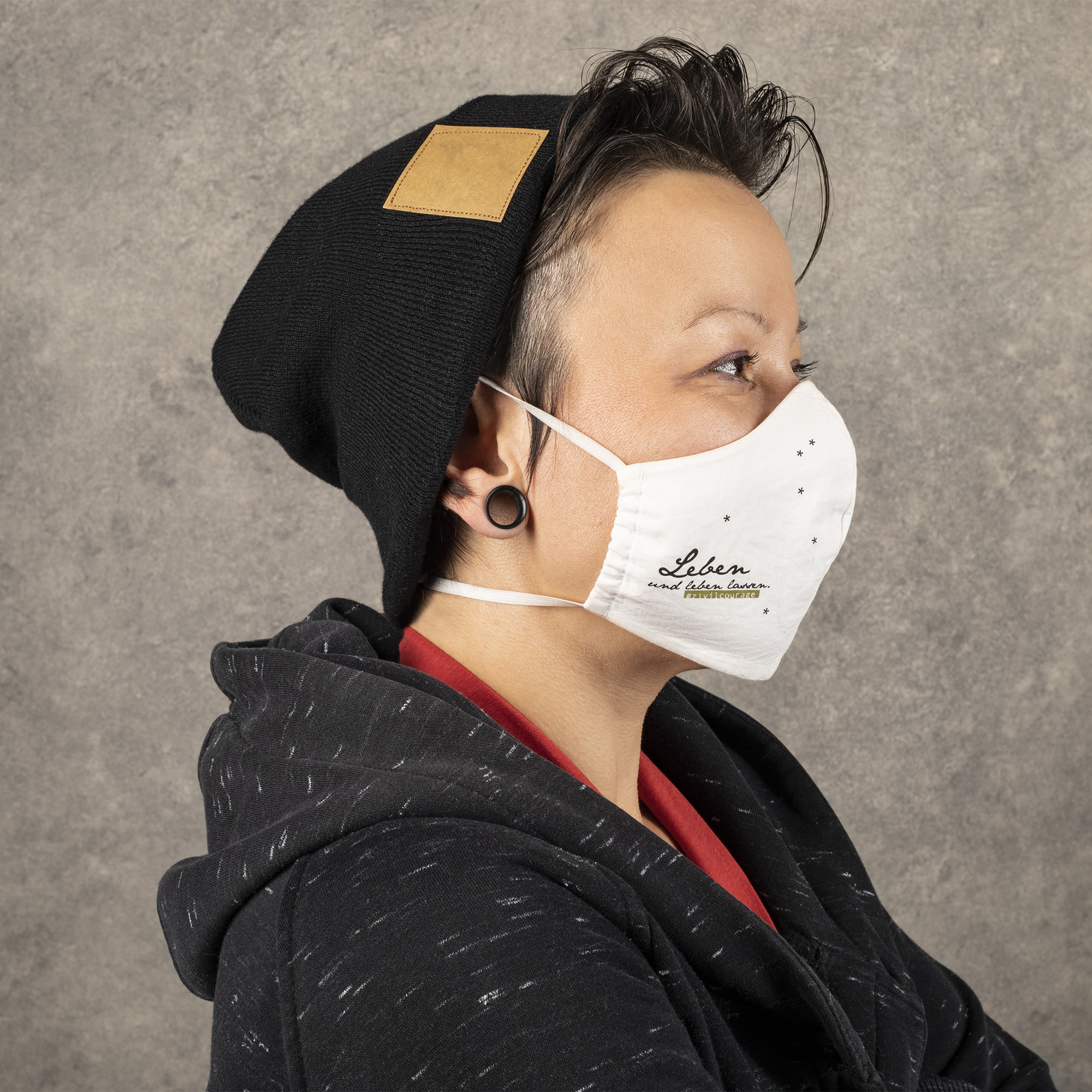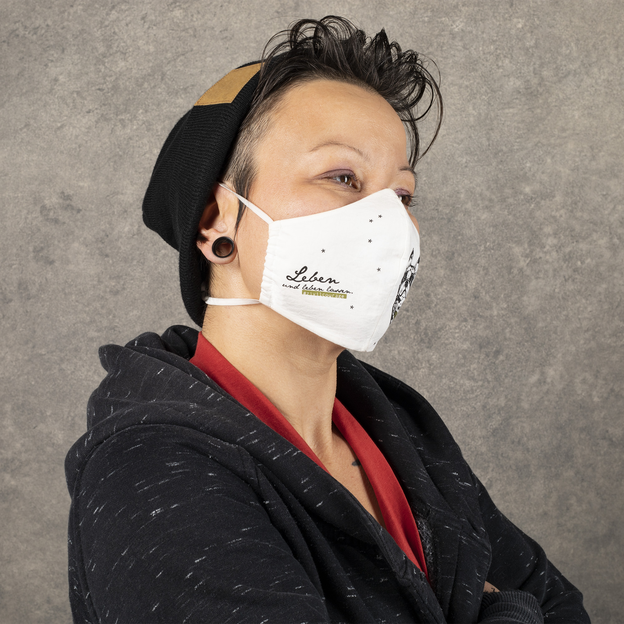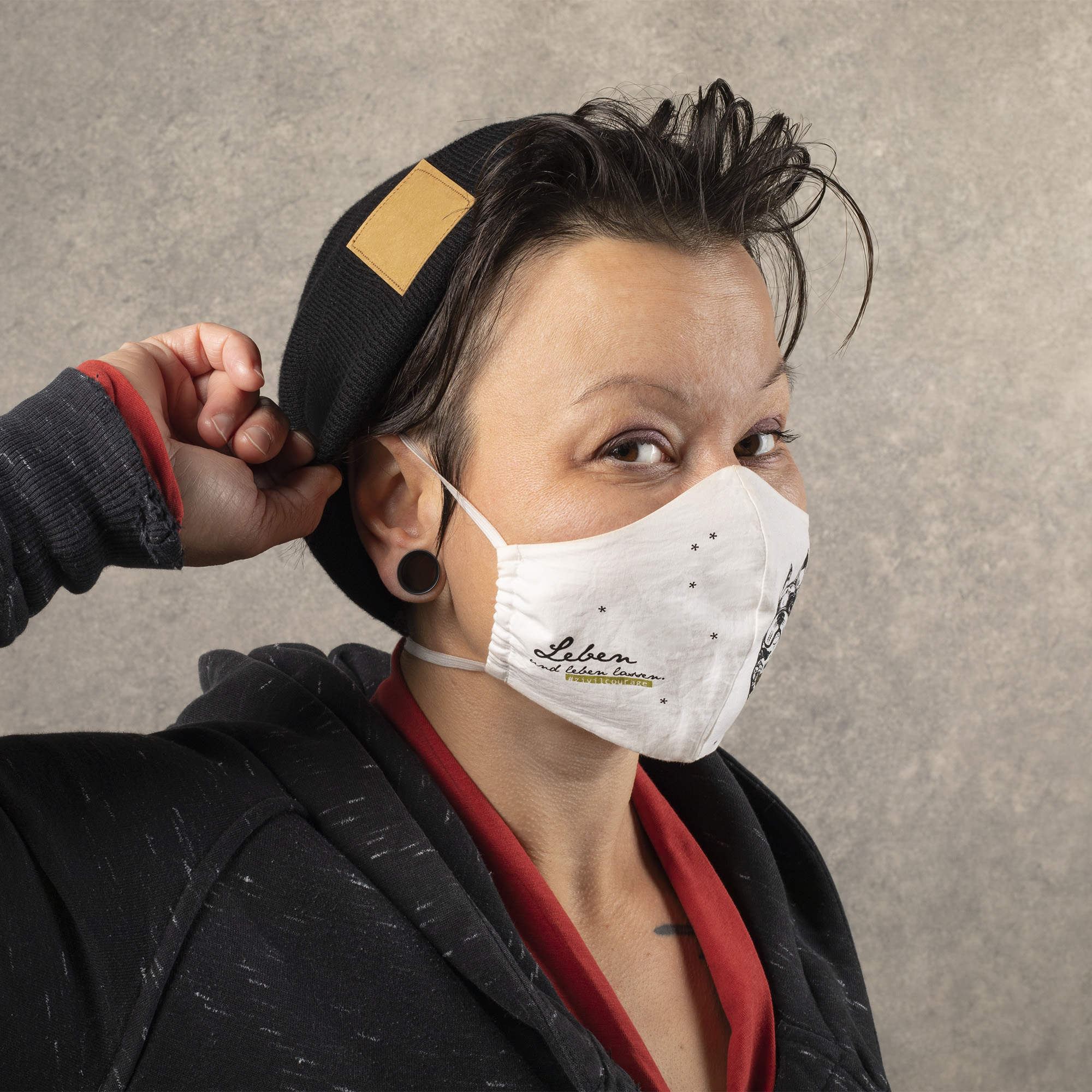 100% Bio-Baumwolle. Mehrwegmaske. Zwei-lagig. Zweifarbiger Druck. Loops / Gummibänder, die über den Kopf gezogen werden und nicht hinter den Ohren getragen werden. Faire Löhne in der gesamten Lieferkette! Made in Portugal / EU. Für kleinere Gesichter optimal.